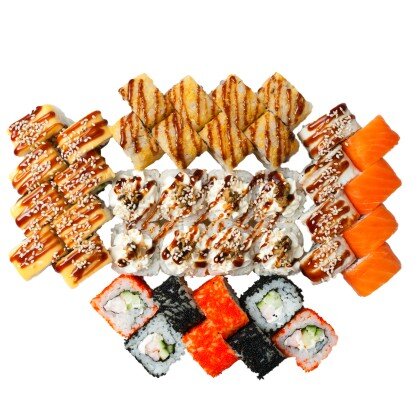 Суши 10шт: лосось, тунец, угорь, гребешок, тигровая креветка, креветка тобико, крем-краб, гребешок тобико, икра масаго, шиитаке и сыр. 10 шт.