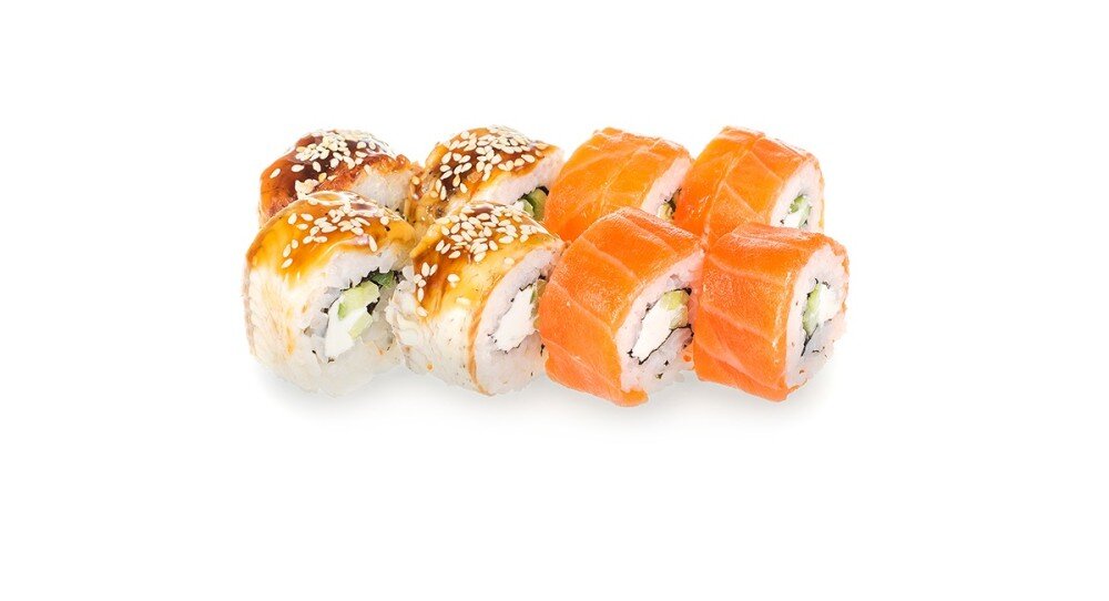 Специально для фанатов ролла Филадельфия! Две половинки Филадельфия оригинал и Филадельфия угорь! 200 г 8 шт.