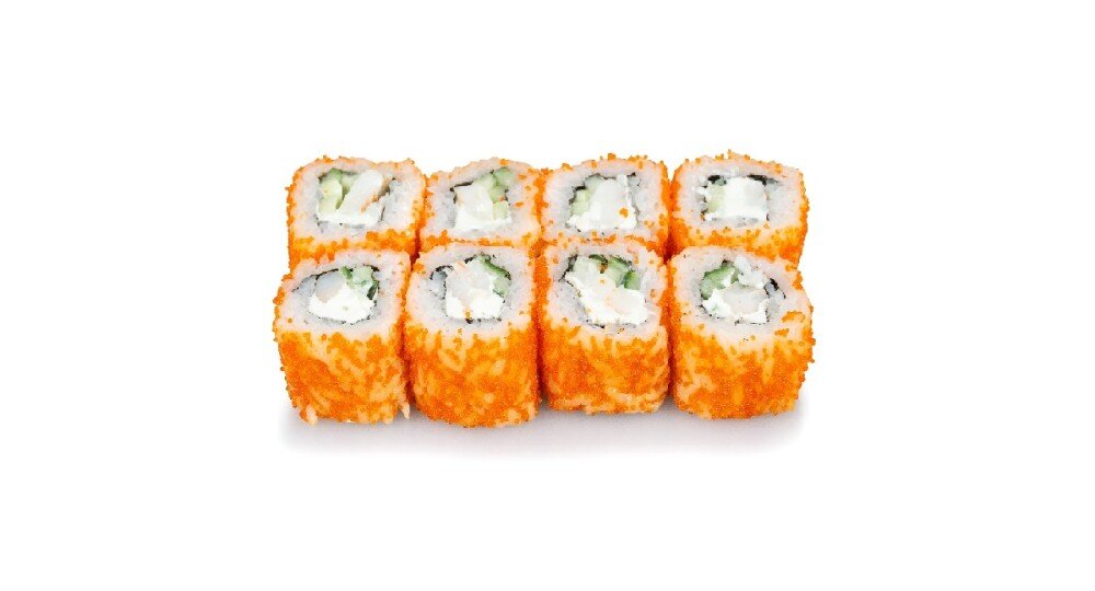 Сочетание тигровой креветочки, творожного сыра и огурчика никого не оставит равнодушным! Ролл окутан икрой масаго 200 г 8 шт.