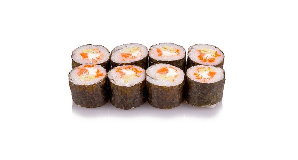 Нежнейший лосось, творожный сыр, икра масаго и японский омлет. Ролл окутан листом нори 175 г 8 шт.