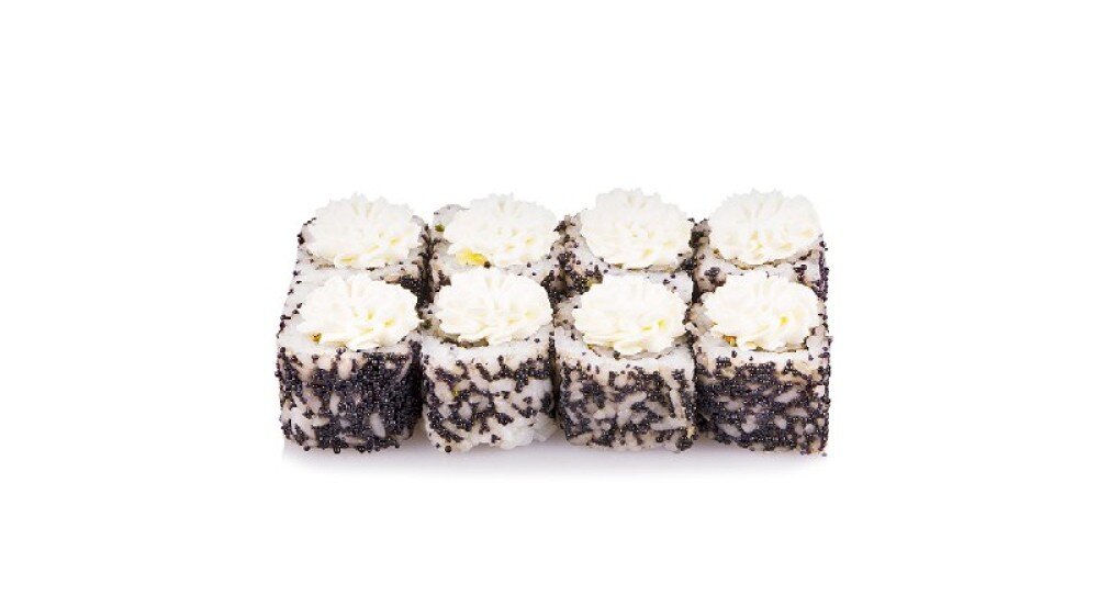 Тунец фри, сливочный сыр и хрустящий огурчик. Ролл в чёрной икре масаго